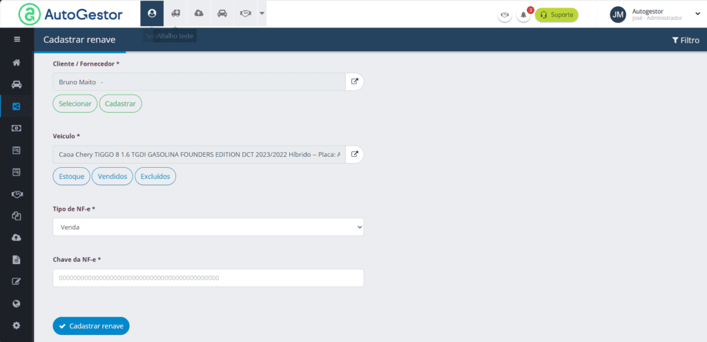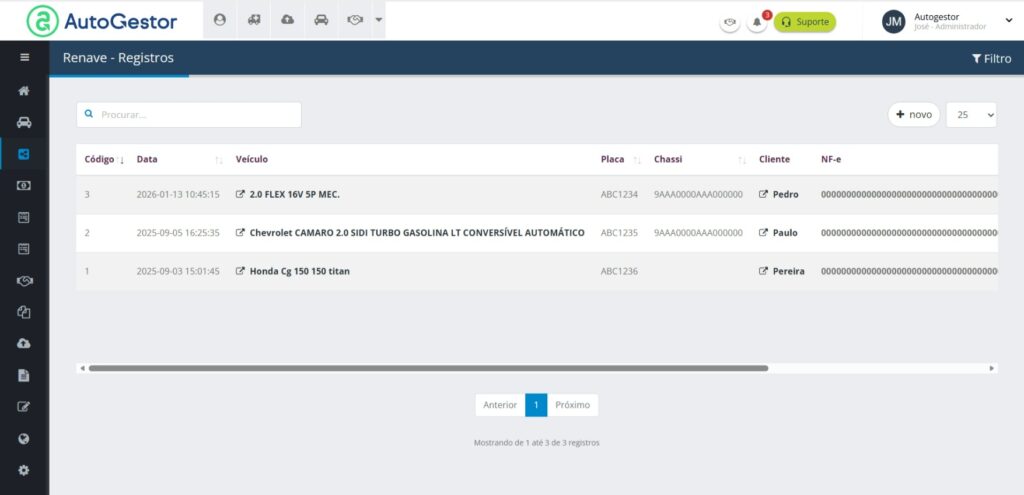 Observação: O AutoGestor não é a integradora e não faz integração direta com o RENAVE. Essa integração é feita apenas via integradoras homologadas como o RenaveFácil e *RenaveAuto.